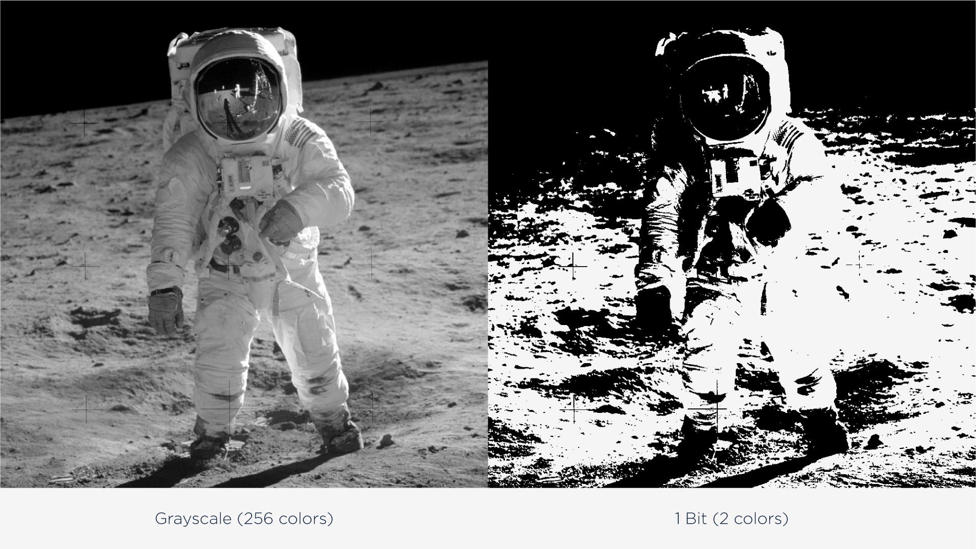 We were inspired by the halftone print technique, which uses various dot sizes in order to reproduce brightness, and while we could not change the pixel sizing, we could however make use of their density in order to obtain three additional grey tones. This technique helped us generate shadow effects, volumes and various other user interface elements.