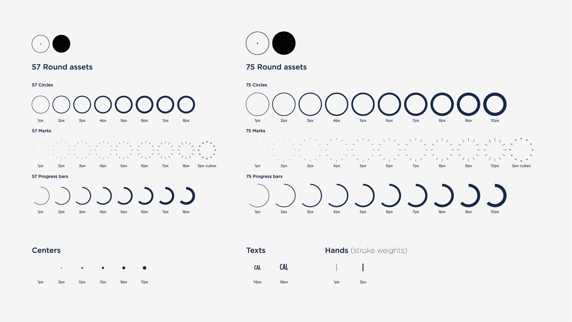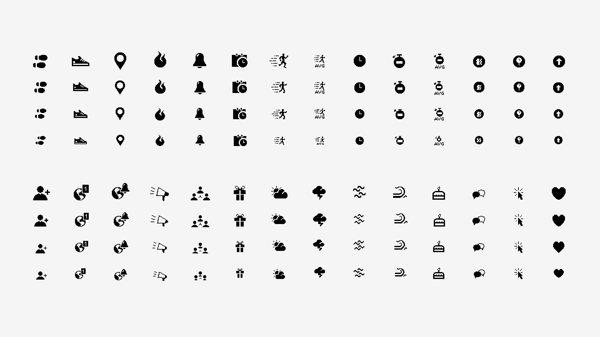 Since the watch had to support app integrations, the next step after creating the custom fonts was to design the accompanying icon set. Based on the grid and usability rules we ended up with 4 different sizes for each icon. The icons helped the standard app development process as wand at the same time they were offered to third-party developers that wanted to contribute with their own creations. We didn’t want to let other people add new graphic elements to the watch in this first version, primarily for interface consistency and at the same time utilizing the standard set also saved memory space in the system. Since the watch had to support app integrations, the next step after creating the custom fonts was to design the accompanying icon set. Based on the grid and usability rules we ended up with 4 different sizes for each icon. The icons helped the standard app development process as wand at the same time they were offered to third-party developers that wanted to contribute with their own creations. We didn’t want to let other people add new graphic elements to the watch in this first version, primarily for interface consistency and at the same time utilizing the standard set also saved memory space in the system.